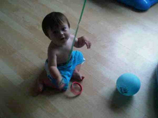 Little Ellis Kirby, age 1, from England, playing under the watchful eye of his parents with birthday balloons in his stylish Diesel beach set shorts!